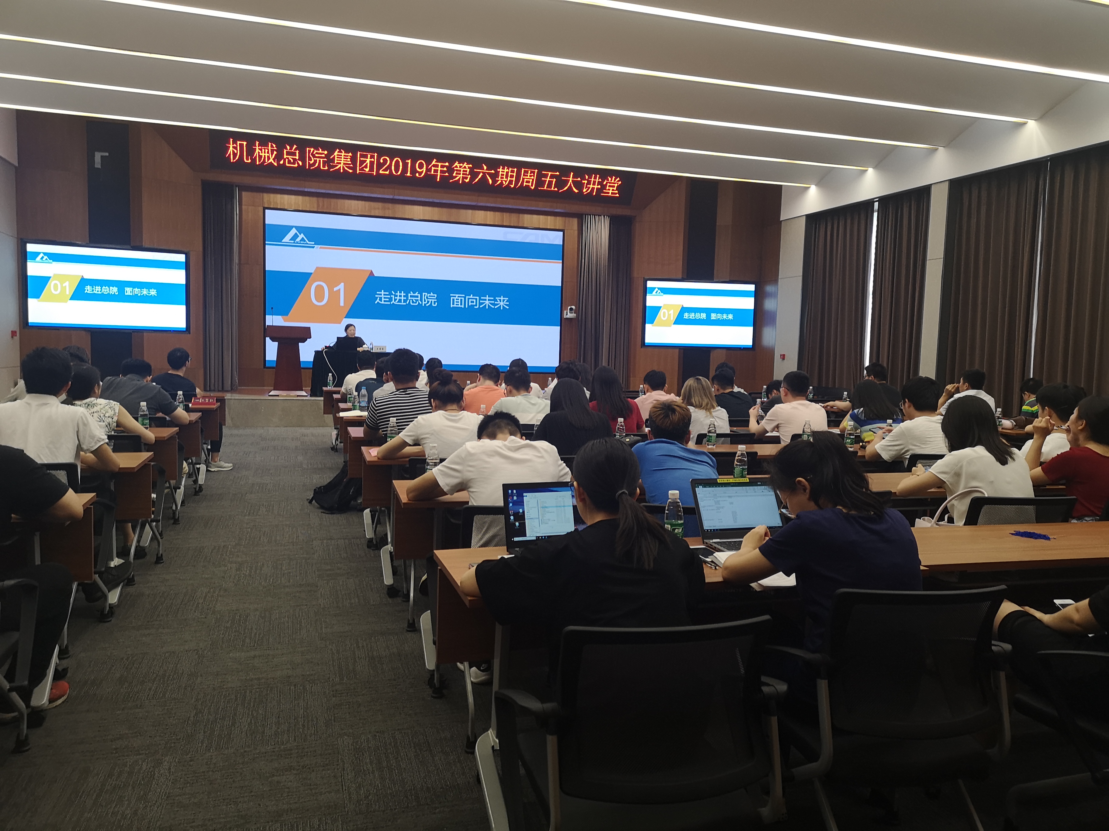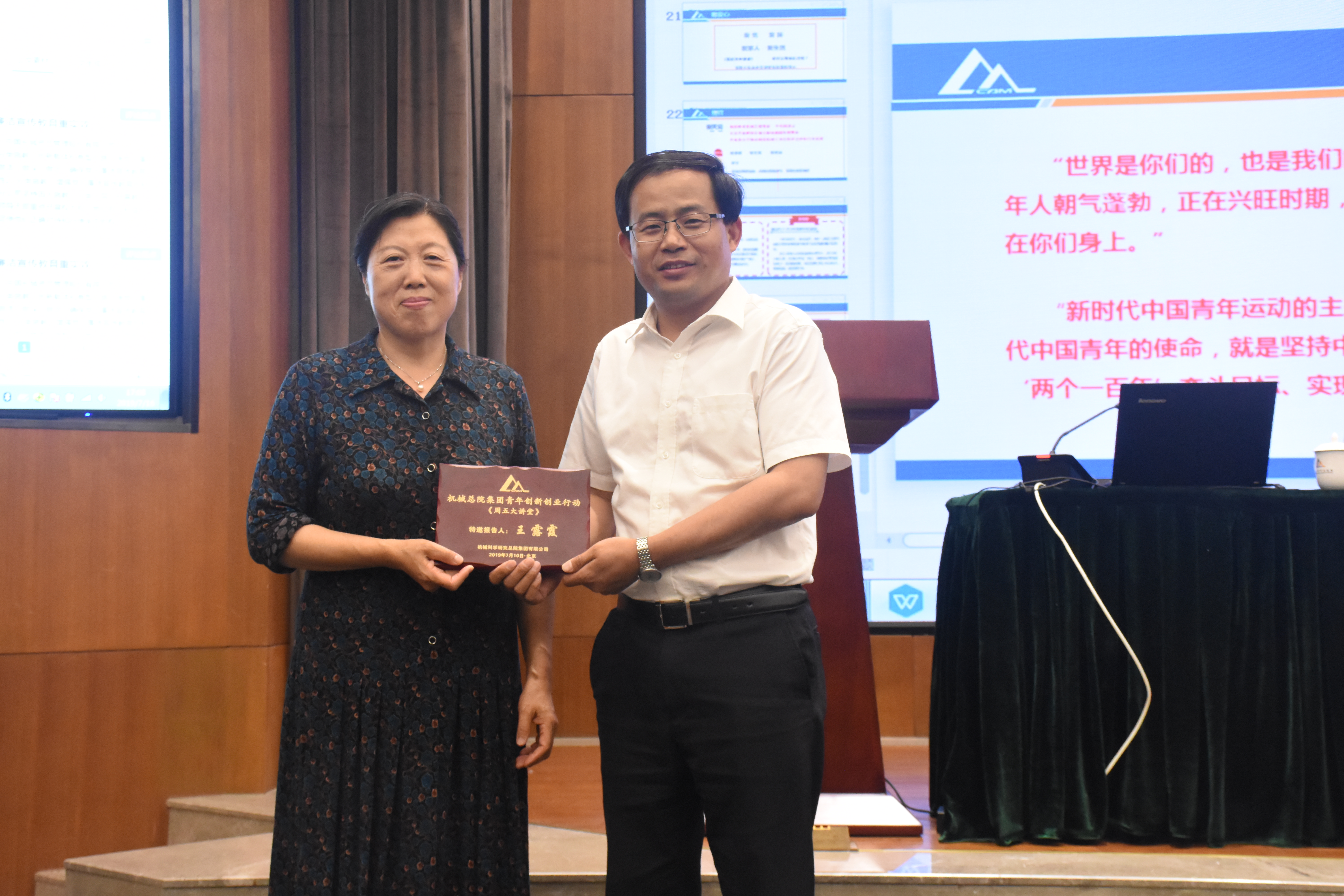 7月16日下午,人资部和机械总院集团团委共同举办了2019年第六期周五大讲堂,本次讲堂邀请到原机械总院党委副书记、纪委书记、副院长王露霞同志,做题为“建功立业新时代”的主题讲座,集团单忠德副总经理主持并为王露霞老师颁发纪念奖牌,总院集团及在京各二级单位七十余名研究生、青年员工聆听了本次报告。